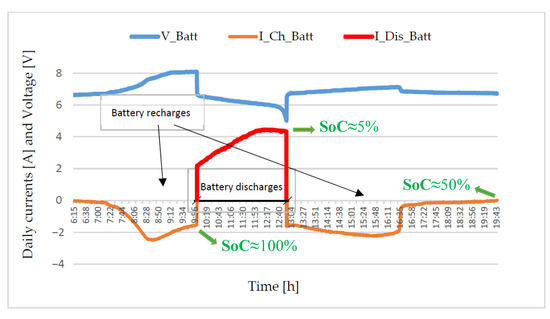 Daily curves of (i) the charging current of the battery (I_Ch_Batt), (ii) the discharging current of the battery (I_Dis_Batt), and (iii) the voltage of the battery (V_Batt) during the experiment referred to in Figure 16. The values of the state of charge (SoC) of the battery are also reported, as estimated offline in correspondence to most relevant time occurrences.