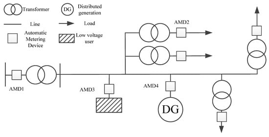 Electric power enterprises require all units to actively build and improve the gateway energy automatic measurement system platform, to achieve the “full coverage” of gateway energy measurement at all levels, and the data are returned “without missing and abnormal numbers”, aiming at meeting the functions of unit energy statistical calculation, line loss theoretical calculation, various gateway management, system parameter management, basic data query, system structure and topology analysis at all levels. In principle, the corresponding basic data should be updated and maintained in the shortest time after the change of power grid equipment (including metering device) and power grid operation mode. Figure 1 is a schematic diagram of a 10 kV distribution network with distributed power supply equipped with an automatic metering device (AMD).