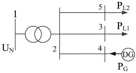In order to briefly explain the principle of line loss interval calculation, the 5-bus system in Figure 2 is taken as an example to calculate line loss of the distribution network in T period. In Figure 2, bus 1 is the first bus of distribution network, bus 3 and 5 are load buses, and bus 4 is connected to a DG. is the voltage of first bus of the distribution network. is the active load of load bus 3 and 5, respectively, and is the active power output of DG. are all time-varying, which are functions of time t. For simplicity, it is assumed that the reactive power of load and DG is 0, the metering data of bus 5 is missing, and the metering data of other buses are normal.