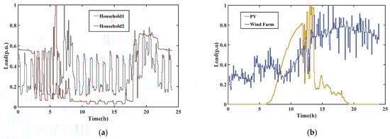 Daily load and output curve. (a) Daily load curve of two families in the United States, and (b) daily output curve of wind power and photovoltaic.