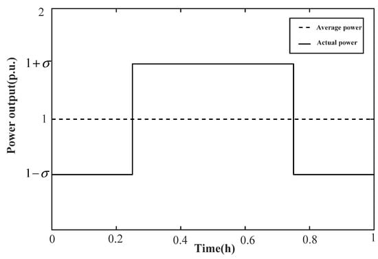 Due to the randomness of DG, the power fluctuates in the range of [,] within one hour. It is Assumed that the resistance of the branch connected to the DG is R, and the DG adopts PV control mode, that is, the voltage remains unchanged at 1 (p.u.). Ignoring the voltage drop of the branch, the electric quantity within one hour is measured by a watt hour meter. The traditional line loss calculation method assumes that the output of DG remains unchanged within one hour (that is, assuming that the branch power of one hour is shown by the dotted line in Figure 4). In this way, the calculated line loss is R, which is times the actual line loss. The power flow fluctuation of the transmission network in a short time is small, which means is small. Therefore, the difference between the calculated line loss and the actual line loss is small. However, in the distribution network with DG, this method may cause greater error since is larger. In engineering, the shape coefficient of load curve is often used to correct the calculated line loss [9,10]. However, due to the irregularity of the output frequency of DG and the acquisition frequency of metering device, it is actually difficult to obtain an accurate shape coefficient.