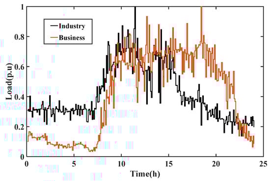 For time-varying systems, the load of each bus is variable at different times. It is assumed that the loads of each bus include residential, commercial and industrial loads, and distributed power generation includes distributed photovoltaic and wind power. The distribution of various loads at each bus is different, but the change curve of the same type of load or DG is the same. The typical load curve of residents and the output curve of wind power and photovoltaic are shown in Figure 3. The commercial and industrial load curves are shown in Figure 6.