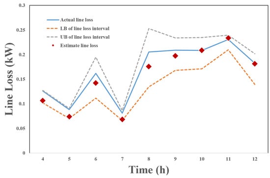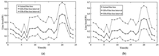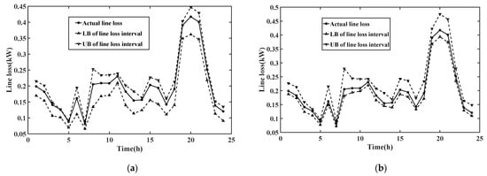 As can be seen from Figure 8, the 24-h line loss interval calculated by the algorithm proposed in this paper is close to the corresponding real value of line loss per hour. When the measurement data of bus 12 are missing, the actual line loss is closer to the lower limit of the calculated line loss interval, while when the measurement data of bus 26 are missing, the actual line loss is closer to the upper limit of the calculated line loss interval. However, the real line loss at all 24 h falls within the line loss interval.