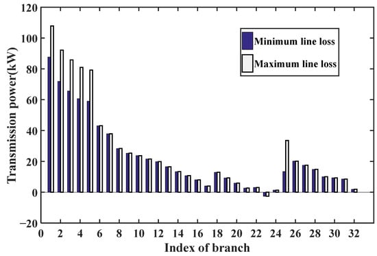 Figure 9 shows the power flow distribution of each branch corresponding to the maximum and minimum line loss when the metering data of bud 26 is missing from 23:00 to 24:00. As can be seen from Figure 9, in most branches, the average power transmission of each branch corresponding to the maximum and minimum line loss is similar. This is due to the fact that the power measurement value of the subsequent buses of these branches is known. The power transmitted by the branches is approximately equal to the sum of the power of the subsequent buses (the line loss is relatively small). It can be seen from Figure 8 that there is a large gap in the power flow distribution corresponding to the branches numbered 1, 2, 3, 4, 5, and 25. The branches numbered 1, 2, 3, 4, 5, and 25 are branches 1–2, 2–3, 3–4, 5–6, and 6–26, respectively. These branches are “upstream” of bus 26. Since the metering data of bus 26 are missing, the power transmitted by these branches can vary in a large range.