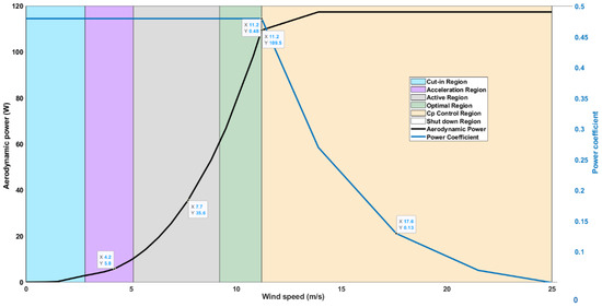 Figure 2 shows the optimal value of the Cp in the different wind speed regions estimated based on the nonlinear optimization model. To better understand the impact of Cp on the mechanical output power of the wind turbine, the wind speed regions were classified into five regions: no power generation region, acceleration region, active region, optimal region, and finally, power coefficient control region.