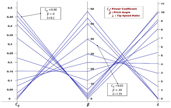 where is the power coefficient; , , , , , and are the aerodynamic power coefficients; is the value of the TSR; is the pitch angle of the blades, and is the TSR of the turbine. , , , and are the coefficients of the TSR; is the mechanical power under nominal wind speed and is a function of torque and angular speed of the turbine in W [21]; v is the wind speed in m/s; is the cut-in wind speed required to acerate the turbine shaft; is the nominal value of the wind speed in m/s; is the cut-out wind speed, which is considered a feasible value for the operation; is the angular speed of the turbine in rad/s; is the torque of the turbine in N-m; is the nominal value of turbine power in W; and is the effective output power of PMSG. is the total power loss, including all stages and types in W, is the lowest pitch angle in degrees, and is the maximum pitch angle in degrees.