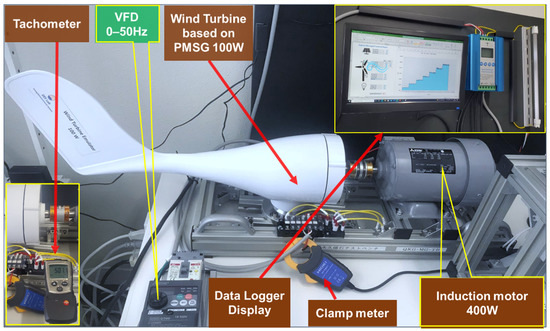 The result obtained from the model was compared with the measured output power from the experimental system. The experimental system consisted of a 100 W horizontal wind turbine emulator installed at the energy and environmental systems laboratory, Kyushu University, Japan. Figure 5 shows the experimental system consisting of a dynamometer coupled with a 100 W horizontal axis dynamo of PMSG, a 400 W induction motor, and a variable frequency device (VFD) to control the linear frequency and change the angular speed of the induction motor.