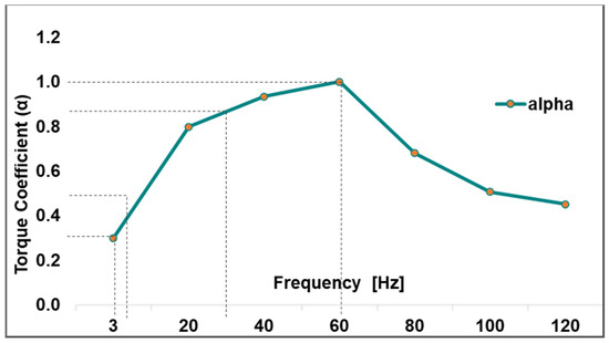 where is the actual torque in N-m and is a dimensionless torque coefficient that can be estimated from the torque coefficient curve given by the manufacturer [41], as shown in Figure 6. The value of the torque coefficient of the four-pole 400 W induction motor changed from 0.3 to 0.5 when the frequency was limited between 3 Hz and 6 Hz: