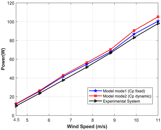 The model was tested in two modes: (1) Given a fixed value of Cp at 0.48 [42] and (2) considering the optimal values of Cp obtained from the model using a wide range of wind speeds (shown in Figure 2). As shown in Figure 7, in both modes, the output power estimated by the model showed a similar trend to the experimental system. During the experimental system measurements, the frequency varied from 20–50 Hz with a 5 Hz step difference, and a total of seven measurements were made in this regard. Likewise, the wind speed based on these frequency values was calculated in the range of 4.49–11 m/s. After applying the same wind regime to the mathematical models for both the fixed Cp and dynamic Cp modes, the power at 30 Hz (6.65 m/s of wind speed) was measured at 37.66 W in the experimental system and found to be 41.54 W and 42.71 W in the fixed Cp and dynamic Cp modes, respectively. Similarly, the power at 45 Hz (9.9 m/s) was measured at 83.01 W and was found to be 86.76 W and 90.52 W for the fixed Cp and dynamic Cp modes. Figure 7 shows the power curves based on both model results and measure data from the experimental system. The trends of the three models can be seen in Figure 7, where the wind speed on the x-axis ranges from 4.5 m/s to 11 m/s, and the power given in W on the y-axis ranges from 0 to 120 W