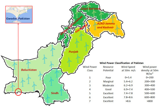 Geographical map of the wind power classification at a 50 m height in different areas in Pakistan [43].