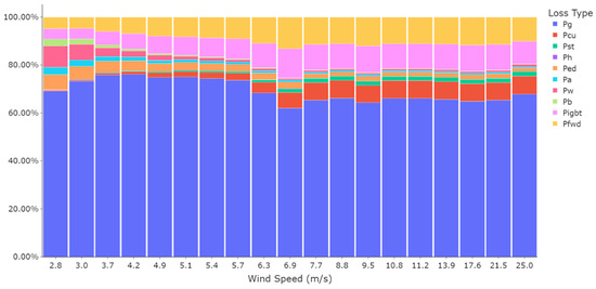 The distribution of power losses based on the optimal value of Cp is depicted in Figure 4. Based on the results of the model, the optimal value of Cp was estimated to be 0.48; thus, 52% of the total energy was lost in the initial mechanical stage of the turbine’s swept area. Similarly, a considerable amount of power was lost in the PMSG in terms of the copper loss, core loss, stray load loss, bearing loss, and windage loss. Likewise, an amount of power was also dissipated in the bi-directional inverter in order to regulate the operating frequency and voltage. These losses included IGBT power dissipation and switching losses. Windage, hysteresis, and eddy current losses dominated within the lower wind regime, while in higher wind regimes, such as 6.3 m/s to 11.2 m/s, the copper, stray load, and IGBTs losses eventually gained high values in this region. At the wind speed of 5.4 m/s, the copper loss increased due to the higher value of the input current. After the nominal wind speed, around 60% of the power drop consisted of copper and bearing loss, and 40% of the total was distributed to other types, such as anomalous, windage, eddy current, and IGBTs losses, as shown in Figure 4.