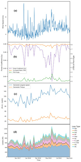 Figure 10d illustrates the power losses in different stages of a wind turbine based on the available range of wind speed, i.e., 0 to 20 m/s. The wind speed peaked in December-2017 and the last quarter of 2018. Therefore, gear and bearing losses were higher in December, and eventually, the electric and power electronics losses rose in June and July. The highest power loss occurred at approximately 1200 W at the end of May 2018 when the wind speed was higher than the rated value of 9.3 m/s. The gear loss varied from 0 to 450 W, depending on the wind speed. At the beginning of August, the gear loss rose unsteadily and reached its maximum value of approximately 450 W due to the rapid variation of wind speed that month. The copper loss was the second highest, followed by the IGBTs losses in the turbine power train, as these were functions of the current and linear frequency, respectively. At the point of the nominal speed, i.e., 9.3 m/s, most losses reached their peak values and became constant with slight variations, such as bearing, stray load, windage, and eddy current loss. This smooth drop in power resulted from optimizing the Cp value by changing the values of the TSR and pitch angle. The cumulative annual electricity generation from the wind turbine system was estimated at 45 MWh, and the total power loss was significantly high, at around 1 MWh in a year.