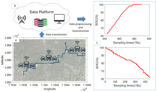 Electric bus operation data transmission and preprocessing results. (a) Driving route, (b) electric vehicle big data cloud platform and (c) preprocessing results of battery SOC.