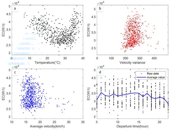 After preprocessing the original data, the data were reconstructed according to the timestamp, vehicle velocity, etc. The vehicle driving season, departure time and velocity-related features were obtained. The statistics of the vehicle energy consumption under different operating conditions are shown in Figure 2. In the figure, the heading of the ordinate is the energy consumption. For brevity, it is abbreviated as EC. For electric vehicles, the operating temperature is related to the use of air conditioning, energy efficiency, etc. Figure 2a shows the relationship between energy consumption and operating temperature. It can be seen that the relationship can be approximated by a parabolic function. The minimum energy consumption occurs at a temperature of approximately 25 degrees. This phenomenon coincides with the fact that air conditioning and high energy transfer efficiency are rarely used [6]. Figure 2b shows the relationship between the variance of velocity and energy consumption. It can be seen that there is an approximately linear relationship between them. The higher the variance, the higher the energy consumption. As shown in Figure 2c, there is no obvious linear relationship between average speed and energy consumption, and this part of the analysis is described in detail later. Figure 2d shows the relationship between departure time and energy consumption. Departure times are related to road congestion and vehicle passenger weight. Specifically, vehicles consume more energy between 6 a.m. and 8 p.m. Vehicle energy consumption values differ by more than 20%.