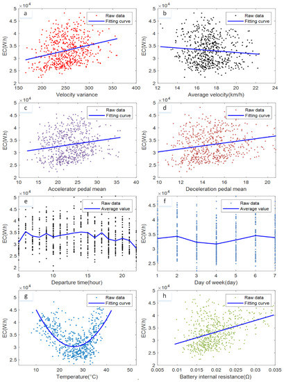 The factors that cause energy consumption fluctuations can be summarized into three aspects, including driving habits, environmental factors and vehicle performance [16]. In terms of driving habits, vehicle velocity, acceleration and deceleration conditions can cause fluctuations in vehicle energy consumption. The conditions can be quantified accordingly as the average vehicle velocity, vehicle velocity variance and number of accelerator pedal presses. In terms of the environmental factors, temperature, which is related to the energy transfer efficiency and air-conditioning usage, is the main factor causing fluctuations in vehicle energy consumption. In addition, the road conditions can also cause fluctuations in energy consumption, such as whether the departure time is congested and whether the departure date is on the weekend [17]. In terms of vehicle performance, the energy efficiency of the battery storage system during the charging and discharging process can also cause energy consumption fluctuations. The energy efficiency is mainly affected by the internal resistance of the battery system and is directly related to the ambient temperature and battery aging. Based on the analysis, the statistical results of the impact of various energy consumption fluctuation factors on vehicle energy consumption are shown in Figure 3. In the figure, it should be noted that the fitting curves were obtained by fitting experimental data with polynomial functions.