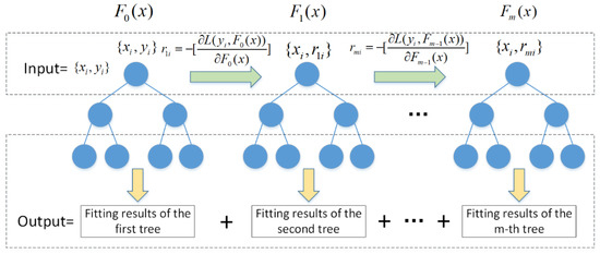 Gradient boosting decision tree is an iterative decision tree algorithm. The algorithm is composed of multiple decision trees, and the results of all trees are accumulated to obtain the final result [20]. Given a training dataset , is the characteristic affecting energy consumption, and is the predicted energy consumption of output. The goal of GBDT is to find a function that minimizes the given loss function . is accumulated by a series of decision trees . Each decision tree is optimized as: