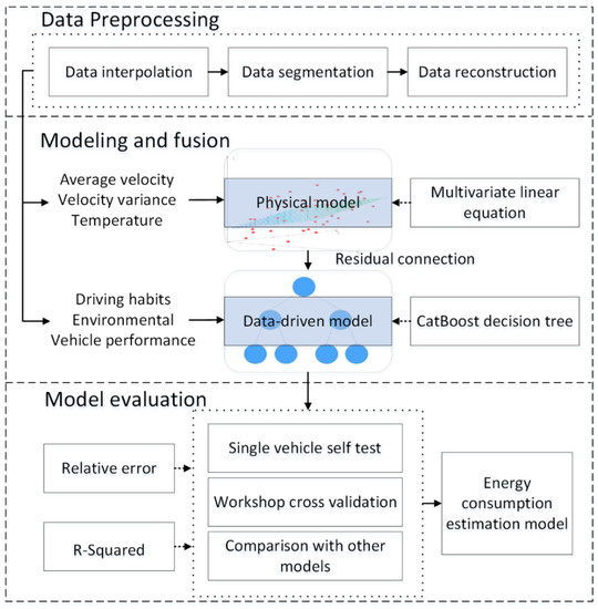 According to the literature review, previous studies have considered physical modeling methods or artificial intelligence algorithms to obtain vehicle energy consumption models. However, vehicle energy consumption is the result of multiple factors. The energy consumption estimation results obtained by a single method or a single type of model are less reliable. Moreover, in practical applications, there is a lack of an energy consumption estimation model with limited input features for driving decision making. It is necessary to design a more reliable energy consumption estimation model with few input features. To address these issues, a physical and data-driven fusion model for vehicle energy consumption is proposed in this paper. Part of the energy consumed by the vehicle during driving can be expressed by physical formulas, such as the energy consumed by rolling resistance and air resistance [11]. The direct application of formula modeling will reduce the complexity of the model. Other driving factors also affect the driving energy consumption of vehicles, such as the vehicle departure time, the ambient temperature, etc. For these factors that cannot be expressed by the formula, the data-driven model is selected. Finally, the two models are fused to estimate vehicle energy consumption.