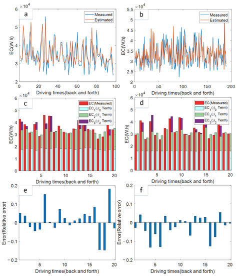 It can be seen that the vehicle’s rolling drag energy consumption coefficient is the largest. This shows that the main energy consumption of the vehicle during driving is consumed by the rolling drag. In the figure, Figure 6a,b compare the fitted values of the model with the real values of vehicle energy consumption. In the figure, the x-axis represents the number of vehicle round trips, and the y-axis represents the energy consumption. The model-fitting results are close to the values in terms of vehicle energy consumption data. Figure 6c,d show the proportion of the energy consumption of each component in the total energy consumption as a histogram. It is obvious that rolling drag and kinetic energy change dominate the energy consumption. Since the use of an air conditioner is closely related to the temperature difference between inside and outside the vehicle, the energy consumption data of the air conditioner fluctuate greatly. The errors of the basic energy consumption model are shown in Figure 6e,f. It can be seen that the average error of the estimation results is 7%. Since the model does not consider the influence of energy consumption fluctuations, there are large errors in the estimation of vehicle energy consumption.