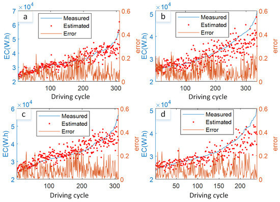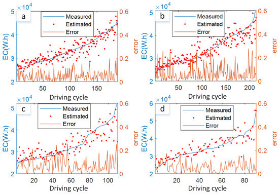 Energy consumption estimation results with the fusion model. (a–d) Bus 1 to Bus 4.