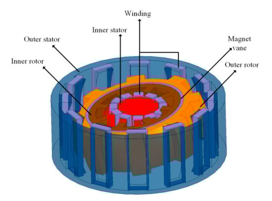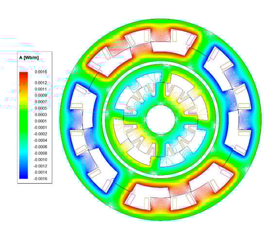 Centralized winding is wound around the salient pole of the stator, while no winding and a permanent magnet exist in the rotor, which avoids the excitation loss and eddy-current loss on the rotor of traditional motors. It can be seen from the magnetic-field-line distribution diagram for the deflection reluctance motor in Figure 3 that the rotor is divided into inner and outer parts through the addition of a magnet vane with good performance, preventing the magnetic circuit of the inner and outer rotors from crossing and reducing the waste of magnetic field energy.