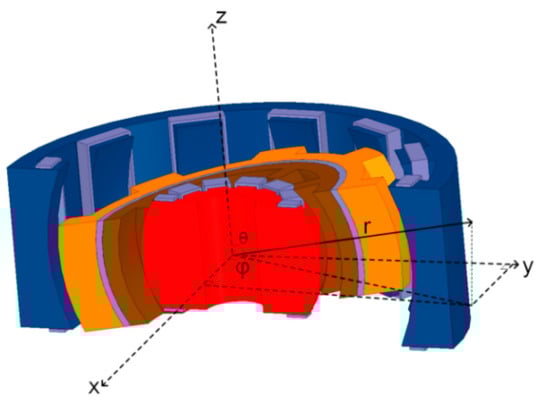 In Equation (9), is the magnetic co-energy of the winding, is the internal magnetic co-energy increment of the coupled magnetic field in the rotor displacement increment , and is the winding energy storage. The and expressions are: