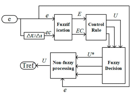 The fuzzy PID controller makes self-adaptive adjustments to the low precision and poor anti-interference ability of the PID control so that the output PID parameters can reach a certain precision. Fuzzy PID control structure is shown in Figure 4. The speed difference, e, is set as the fuzzy PID speed controller input. First, the speed difference e is integrated to obtain the speed deviation change rate, ec, then e and ec are jointly imported into the two-dimensional fuzzy controller to use the membership function to fuzzify it; the obtained fuzzy quantities EC and E are reasoned according to the adjusted fuzzy control rules, and the fuzzy output value U* is determined, and finally, the fuzzy output value is clarified and the PID output value Tref is obtained.
