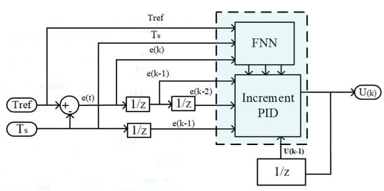 The FNN PID control structure is shown in Figure 6. With the advantage of a flexible neural network using the fastest descent method, the weights are constantly modified, and the structure features are as follows: the parameters of the excitation function of the hidden layer and the output layer are adjustable, which can accelerate the learning speed of the neural network. It can effectively prevent the neuron excitation function from entering the false saturation state so that the network weight cannot be modified. Tref comes from the previous fuzzy controller, and Ts comes from the switched reluctance motor model.