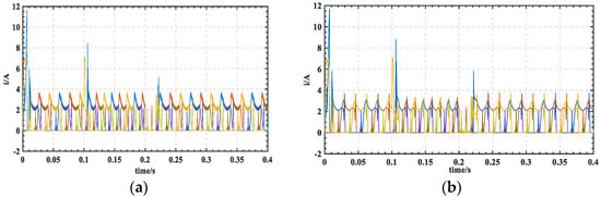 Through observation, it can be found that the current in Figure 8a cannot be adjusted to a stable current state in time during commutation adjustment, especially when the current value fluctuates greatly between 2–4 A, which shortens the life of electronic devices by a long time. In Figure 8b, it can be found that the current adjustment ability is significantly improved and the current stability is strengthened.