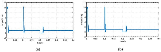 It can be seen from Figure 9a that the output torque under ordinary PI control had a large torque fluctuation from moment 0.013 s to moment 0.1 s, and the amplitude is about 0.28 N·m. However, compared with Figure 9b, it is obvious that the torque fluctuation decreased a lot in this period, and the amplitude was about 0.038 N·m. When the speed of 0.1 s directly rose to 200 r/min, a slight instantaneous overload phenomenon appeared in the torque. Under ordinary PI control, the maximum instantaneous overload torque reached 10.3 N·m, while under flexible neural network control, the maximum instantaneous torque reached 10.05 N·m. When the speed decreased to 150 r/min at 0.2 s, the torque fluctuation of the flexible neural network was obviously smaller than that of the ordinary PI control.