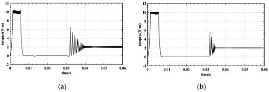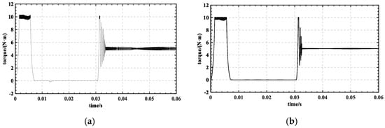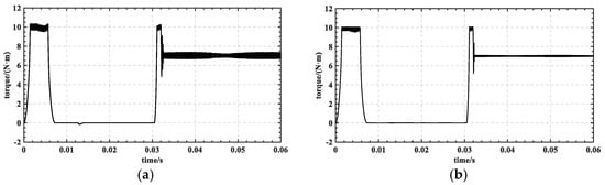Figure 11b shows that the starting torque did not exceed the rated torque by 10 N·m and the torque fluctuation was small. Compared with the waveform of the ordinary PI control, there is almost no torque fluctuation between 0.007 and 0.03 s. After increasing the load, the torque could rise directly and start adjustment, and the final torque fluctuation drooped below 5.6 N·m. When the adjustment time dropped to 0.003 s, i.e., 0.035 s, the torque fluctuation tended to be gentle, and the subsequent torque fluctuation amplitude decreased significantly in comparison with that shown in Figure 11a. Therefore, flexible neural network control can effectively improve DSRM torque control under load.