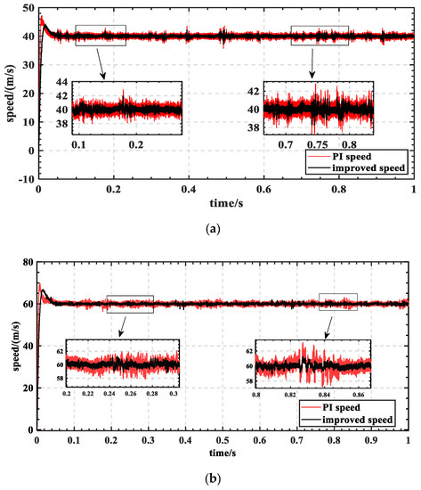 The experimental platform of the deflection switched reluctance motor was built, and the traditional PI control and the control which is proposed in this paper were respectively built for comparative experimental verification. Figure 15 shows the contrast in the control system running speed at the different given speeds of 40, 60, and 80 r/min. Figure 15a shows the running speed of the two control systems at a given speed of 40 r/min. Contrasting with the traditional PI control, the control system designed in this paper has smaller overshoot and shorter adjustment time. Speed jitter after smooth operation is also greatly reduced. Figure 15b,c shows the comparison of the operating speeds of the two control systems at given speeds of 60 r/min and 80 r/min. At the given speeds of 60 and 80 r/min, the two control systems run similarly. The control system designed in this paper has a smaller overshoot and a smaller jitter.