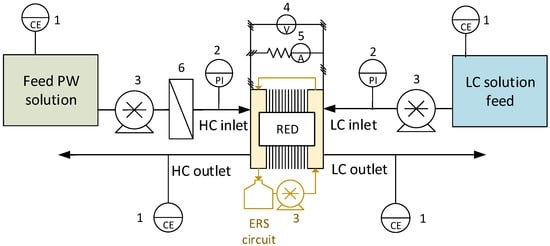 An RED unit is made of several repetitive units called cell pairs, consisting of two channels and two IEMs, i.e., an anion exchange membrane (AEM) and a cation exchange membrane (CEM). Spacers are interposed between the membranes to generate the two channels where a concentrate solution (or high-concentration solution, HC) and a dilute solution (or low-concentration solution, LC) are alternatively fed. The salinity gradient across each IEM generates a potential difference, leading to an ionic flux between the two adjacent solutions. At the two ends of the stack, electrode compartments are placed. In these compartments, an electrode rinse solution (ERS), containing redox couples, is continuously recirculated, allowing the conversion of the ionic flux into electric current when an external load is connected to the RED unit. Between each electrode compartment and the cell pairs, an end-membrane is interposed.