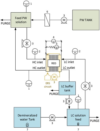 Two different real wastewaters (PW1 and PW2), from two different oil industrial wells located in southern Europe, were studied as the feed solution in an RED unit. After an in-place oil separation treatment, they were used as high-concentration feed (HC). The main features of these solutions are reported in