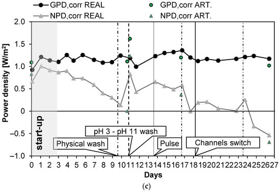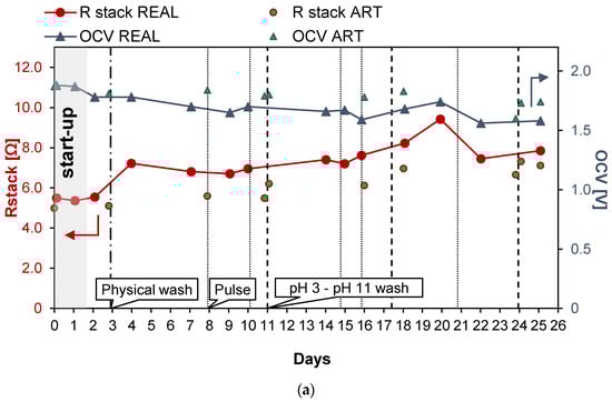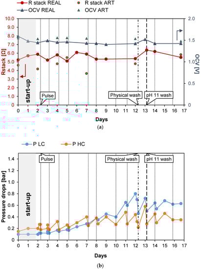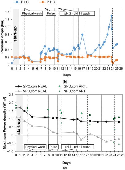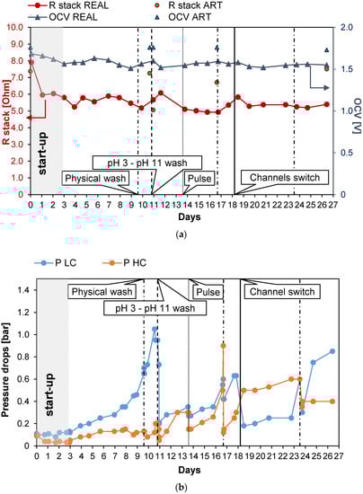 a), evaluating the temporal variation of the power density, the stack resistance, and the pressure drops. This guaranteed monitoring of the conditions of the IEMs exposed to fouling issues. A schematic representation of the test rig is reported in