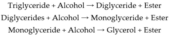 Due to the high viscosity and density, the direct use of oil in a diesel engine is difficult. To improve the performance characteristics, an oil transesterification process is applied. This process involves the conversion of triglycerides, which contain three fatty acid molecules, first to diglycerides, then to monoglycerides, and finally to the trihydroxyl alcohol glycerol and shorter three fatty acid ester molecules. The separation of glycerol gives a product with a lower viscosity and density, namely, biodiesel, which can be used directly in a diesel engine. To complete the transesterification reaction, three molecules of alcohol are required per molecule of triglycerides to give one molecule of glycerol and three molecules of fatty acid methyl esters (Figure 1). Because the reaction is reversible, it is recommended to use a super-stoichiometric amount of alcohol to shift the equilibrium and increase the fatty acid ester yield [51,52,53,54].