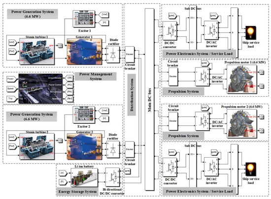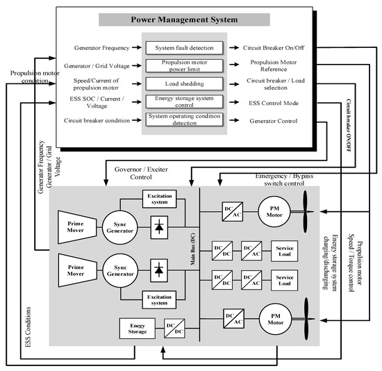Figure 6 shows the configuration of the power management system (PMS), which performs a variety of roles: total ship system control, monitoring, and checking the availability of the electrical power depending on the electrical network status [31,32,33,34,35,36]. The PMS makes it possible to determine the operating status, limit the output power of the propulsion motor, shed the load in accordance with the priorities, control the energy storage system, and detect the system operating mode. Figure 6 suggests a general configuration without designing and reflecting the actual PMS and is modeled to be the background of the simulation results.
