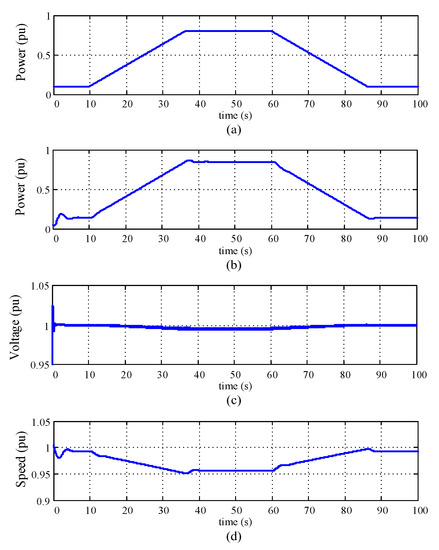 Figure 2 shows the waveforms of the simulation results of the power generation system. Figure 2a shows the output power of the propulsion motor which was driven by the ramped reference. According to the demand of the load power, Figure 2b–d shows the output power of the steam turbine, DC bus voltage, and the frequency of the generator, respectively.