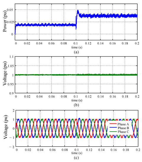 Simulation results of the power electronics system: (a) Load power; (b) Output voltage of the DC/DC converter; (c) Output voltages of the DC/AC inverter.