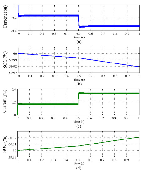 Simulation results of the energy storage system: (a) Battery discharge current; (b) Battery SOC in case of discharge; (c) Battery charge current; (d) Battery SOC in case of charge.