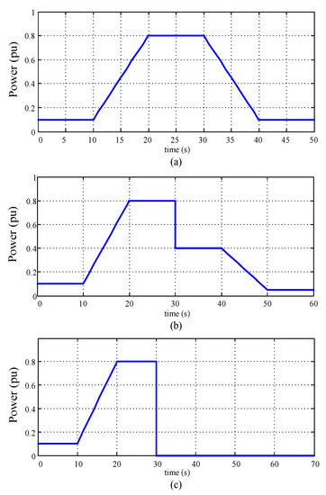 The full simulation model of the AES was combined to obtain the electrical characteristics of the various ship operating conditions. Both voltage and frequency stability are important issues in the power system of the all-electric ship. As such, strict rules need to be established to guarantee secure operation under various operating conditions, such as STANAG 1008, IEC 60092/101, IEEE Std 1709–2010, and MIL Std 1339 [37,38,39,40]. IEEE Std 1709−2010 and STANAG 1008 were used to evaluate the resulting simulation performance. As per IEEE Std 1709−2010, the limitations of the steady state DC voltage tolerances should be within ±10%. Transient state DC voltage can be allowed to have a tolerance of 200% from 0.1 to 10 ms. Frequency stability is referenced with regard to STANAG 1008. This defines the frequency limits for the steady state to be ±3%, and momentary deviations could be allowed to be about ±4%, respectively. A total of three different operating conditions were simulated for the purpose of evaluating the performance of the proposed simulation model. Figure 7 shows three operation conditions of the propulsion motor.