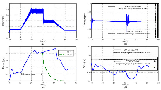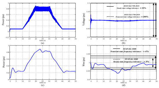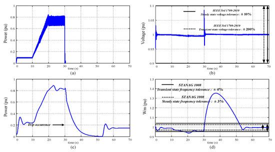 Figure 10 shows the simulation results of the full propulsion load rejection. The turbine generator set supplies the propulsion motor at 80% power, then the circuit breaker of the propulsion motor is open for the purpose of the trip operation. As shown in Figure 10, after the full propulsion load is removed from the electrical distribution system of the ship, the DC bus voltage rises to 1.1 times higher than the rated voltage but it is tolerable by the IEEE Std 1709–2010. However, as shown in Figure 10d, the generator frequency exceeds over approximately 35% and remains around there for about 25 s, which are not tolerable by the IEEE std 1709–2010.