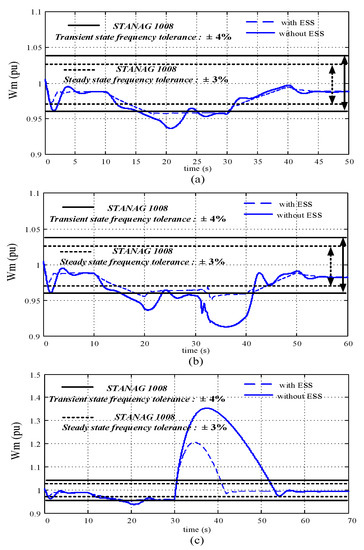 As shown in Figure 8, Figure 9 and Figure 10, the transient and the steady state voltages satisfy the IEEE Std 1709–2010 limits. However, note that the energy storage system is required to reduce the fluctuation of the generator frequency and the transient times.