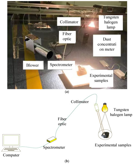 Gangue near-infrared reflection spectrum acquisition device. (a) Physical diagram, (b) Schematic diagram.
