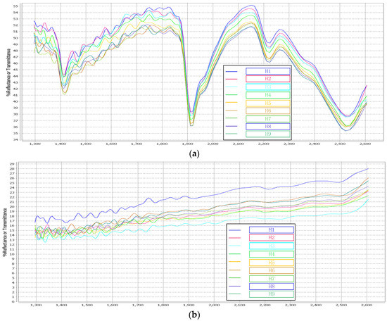 Near-infrared reflectance spectra of coal and gangue samples under different detection distances and dust concentrations. (a) Near-infrared reflection spectral curve of gangue, (b) Near-infrared reflection spectral curve of coal.