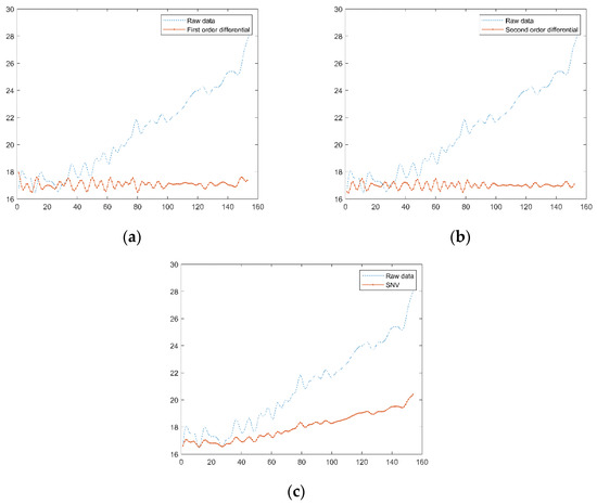 In order to enhance the absorption characteristics of the gangue reflection spectrum and eliminate the influence of the changes in the experimental environment, three methods are used to pre-process the gangue reflection spectral data: first-order differentiation, second-order differentiation and standard normal variable transformation [28]. The pre-processed data are shown in Figure 6. The principles of the three algorithms are as follows: