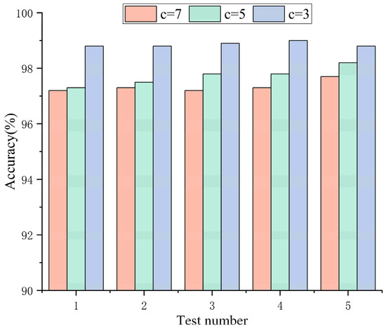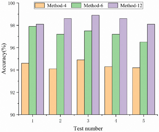This section explores the effect of the number of vit layers in PCViT on the coal gangue identification performance. Three network structures are established in this experiment—PCViT-4, PCViT-6 and PCViT-12—and the ending numbers in their names indicate the number of vit layers, The number of parameters is shown in Table 4. Figure 10 shows the recognition accuracy of the three PCViTs. It is clear that when the number of vit layers increases from four to twelve, the network performance also increases. This indicates that the optimization effects of multiple attention modules can be accumulated in the network, thus continuously improving the network performance. Although more attention modules increase the network parameters, the accuracy of PCViT-6 is improved by about 3% compared to that of PCViT-4, so the small increase in the network parameters is acceptable.