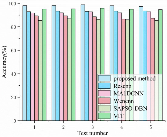 The six deep learning networks are PVCT, VIT [25], Wencnn [29], MA1DCNN [30], a residual convolutional neural network based on 1DCNN (Rescnn) [31] and a deep confidence network (SAPSO-DBN) [32], and the experimental results are shown in Figure 11.