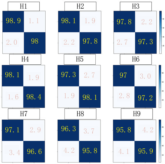 Finally, in order to demonstrate the good performance of the proposed new method, the identification accuracy under various working conditions is analyzed in detail in this paper, and the gangue spectral data of the ideal experimental environment are added. The confusion matrix of PCViT under nine working conditions is given in Figure 13. In this figure, the rows and columns denote the predicted labels and the true labels, respectively. The diagonal cells indicate the accuracy of gangue identification. It can be seen that the model can distinguish the test samples with high accuracy under all of the working conditions, and the recognition accuracy is still about 96% even in the most severe experimental environment (1.8 m–800 mg/m3), which indicates that PCViT has good potential for practical applications.