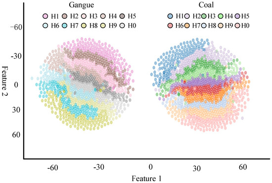 Figure 14 provides the distribution of the output of PCViT prediction in two-dimensional space. The number after the letter H is the corresponding simulated experimental environment, and H0 (1.2 m-None-Full) is the data of the ideal experimental environment. As we can see from the figure, due to the characteristics of the high sensitivity of the NIR spectroscopy technique, the changes in the experimental environment do affect the gangue spectral data, and the different qualities of the experimental samples render the accurate identification of the gangue even more difficult.