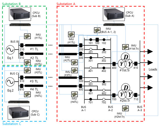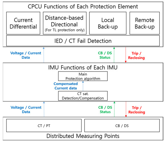 In other words, the centralized protection is provided by receiving data from multiple IMUs installed at the local substation and data from CPCUs installed at the adjacent substations. Reference [1] first introduced the concept of the IMU, which is an acronym for an intelligent merging unit. The IMU has the roles of a main protection device and a merging unit (MU). Thus, it provides the main protection task with local voltage, current, and CB/DS status data, and also sends them to the CPCU.